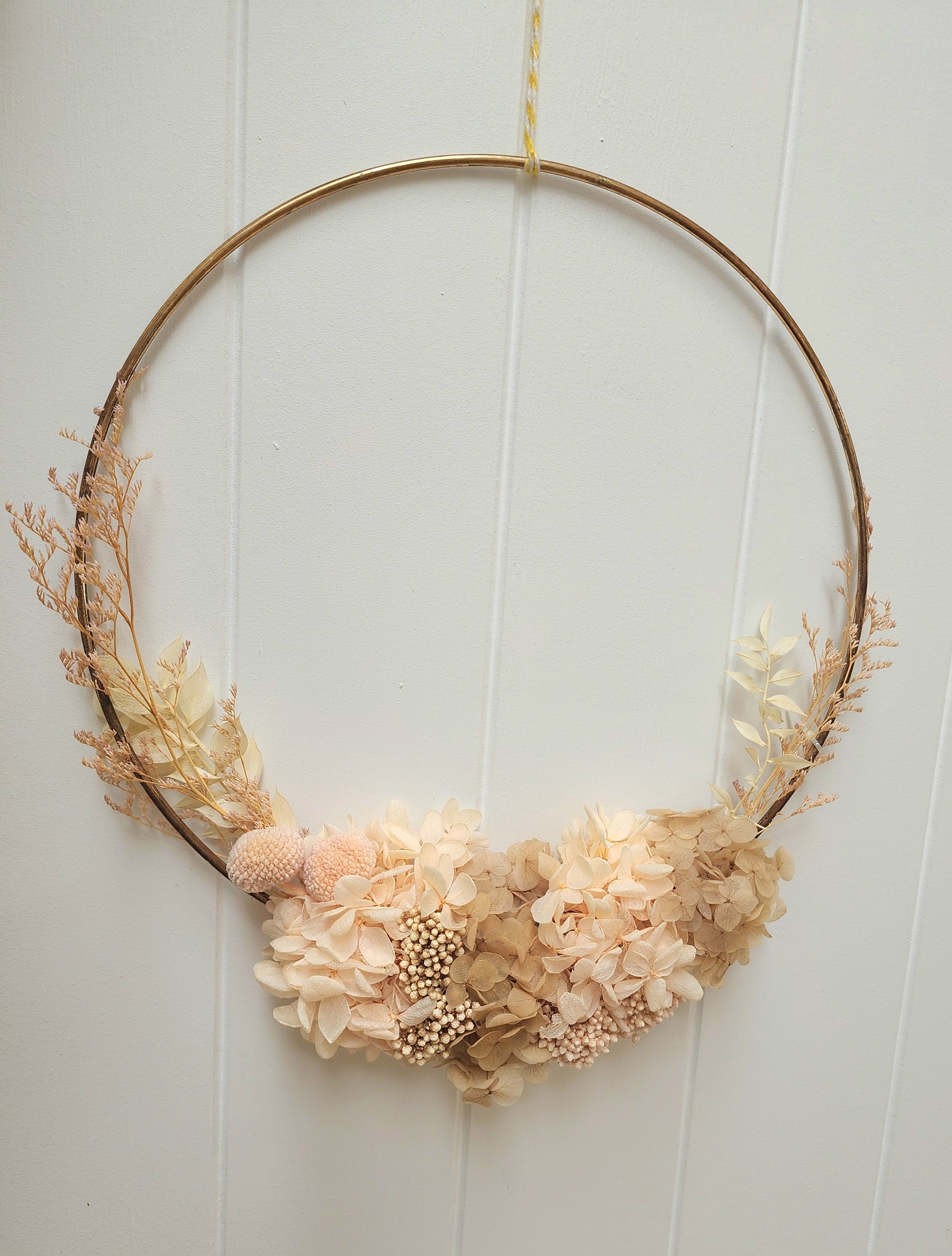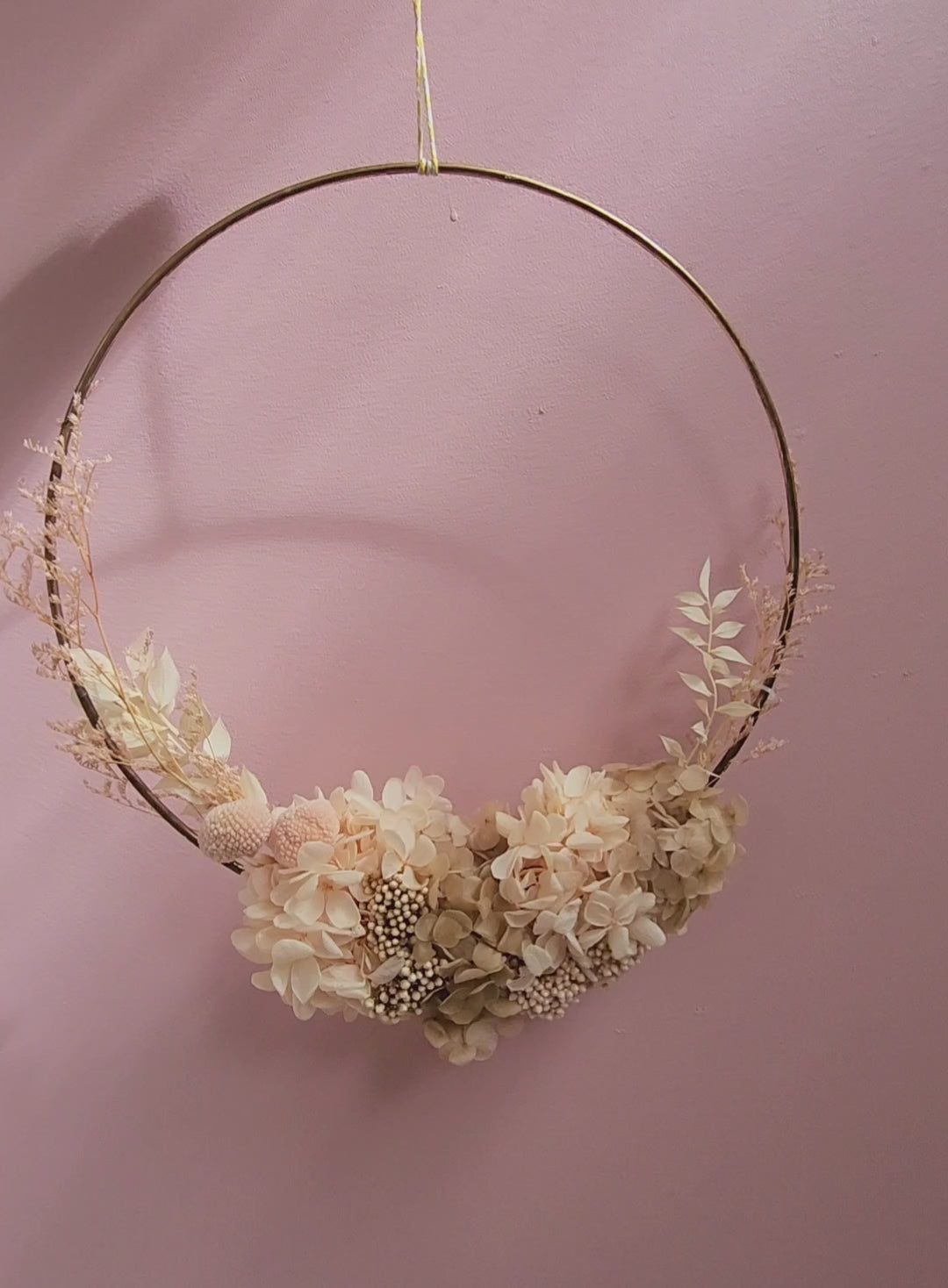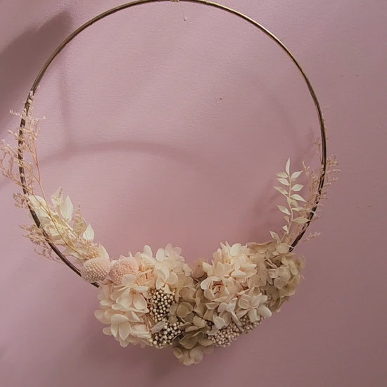 Delicately handcrafted with dried blooms in soft pink, cream, and beige, this wreath brings a gentle, natural touch to any space. Perfect for a nursery, little girl’s room, or to add warmth to a bare wall, its neutral tones blend beautifully with any décor. A simple yet elegant piece that adds charm, texture, and a hint of nature to your home.
