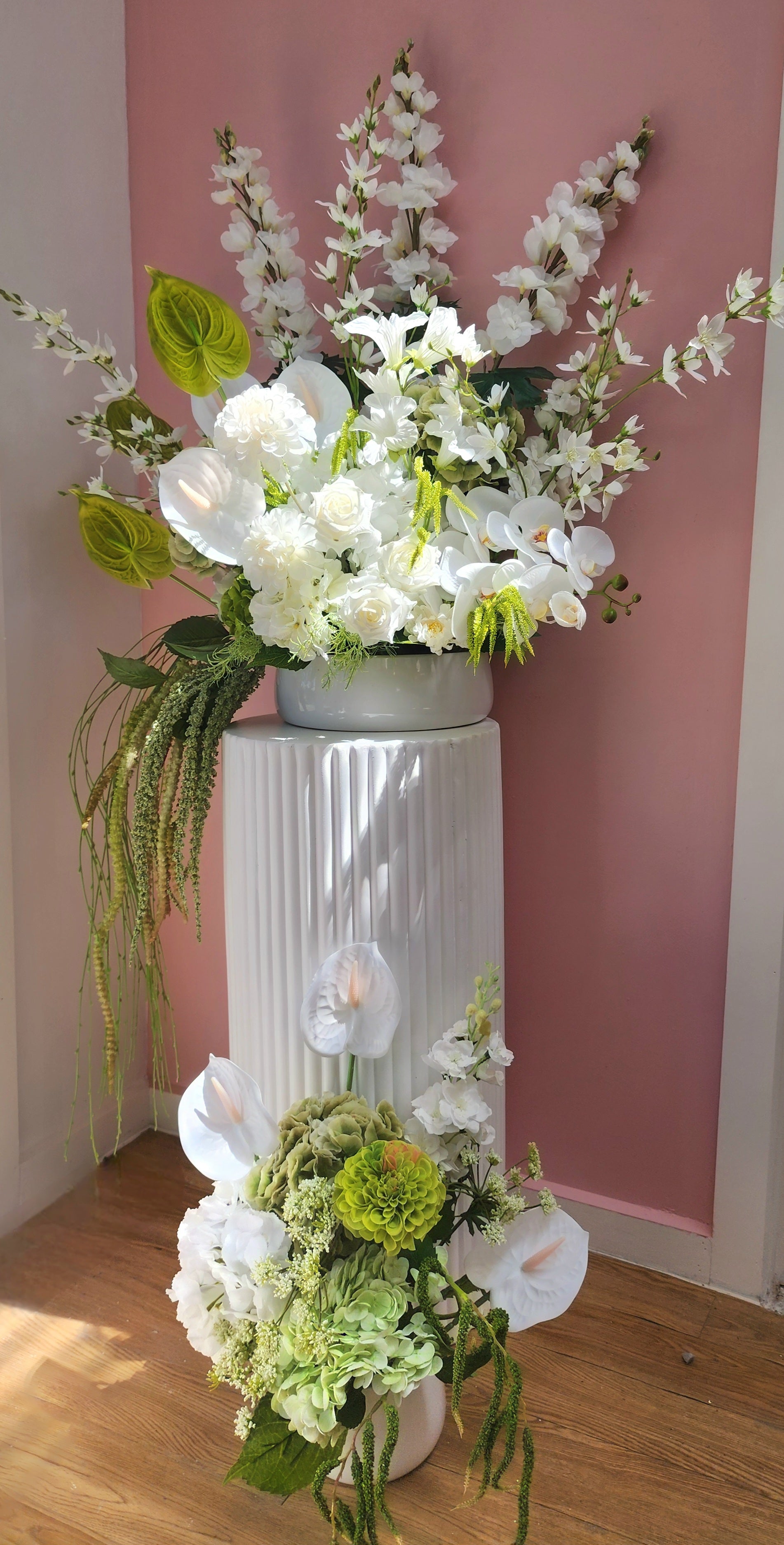 Perfect for wedding ceremony pillars, welcome sign florals, aisle arrangements, plinth styling and event décor. The crisp white palette paired with delicate green accents creates a clean, timeless look that photographs beautifully from every angle — ideal for brides and event stylists seeking high-end, lifelike artificial blooms.